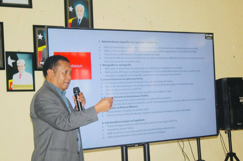 Atividade ne’e, realiza husi Ekipa Avaliasaun Ministerio Administrasaun Estatal (MAE), liderado husi Secretario Ezekutivu PNDS, ho equipa. hodi esplika ba Autoridade Munisipal no Lideransa komunitario sira konaba resultadu Avaliasaun kondisaun minimu, ne’ebe maka hala’o ona iha fulan Dezembro tinan kotuk 2025. Autoridade Munisipio Ainaro hetan kategoria BOM ,Resultado nee baseia ba kriteria , orientasaun husi Sua Exelencia Ministro MAE, konaba sugestaun no rekomendasaun hodi Autoridade tenki halo tuir sugestaun no rekomendasaun sira ne’e, no ekipa nasional tuir planu sei mai fila fali iha fulan abril tinan 2026.