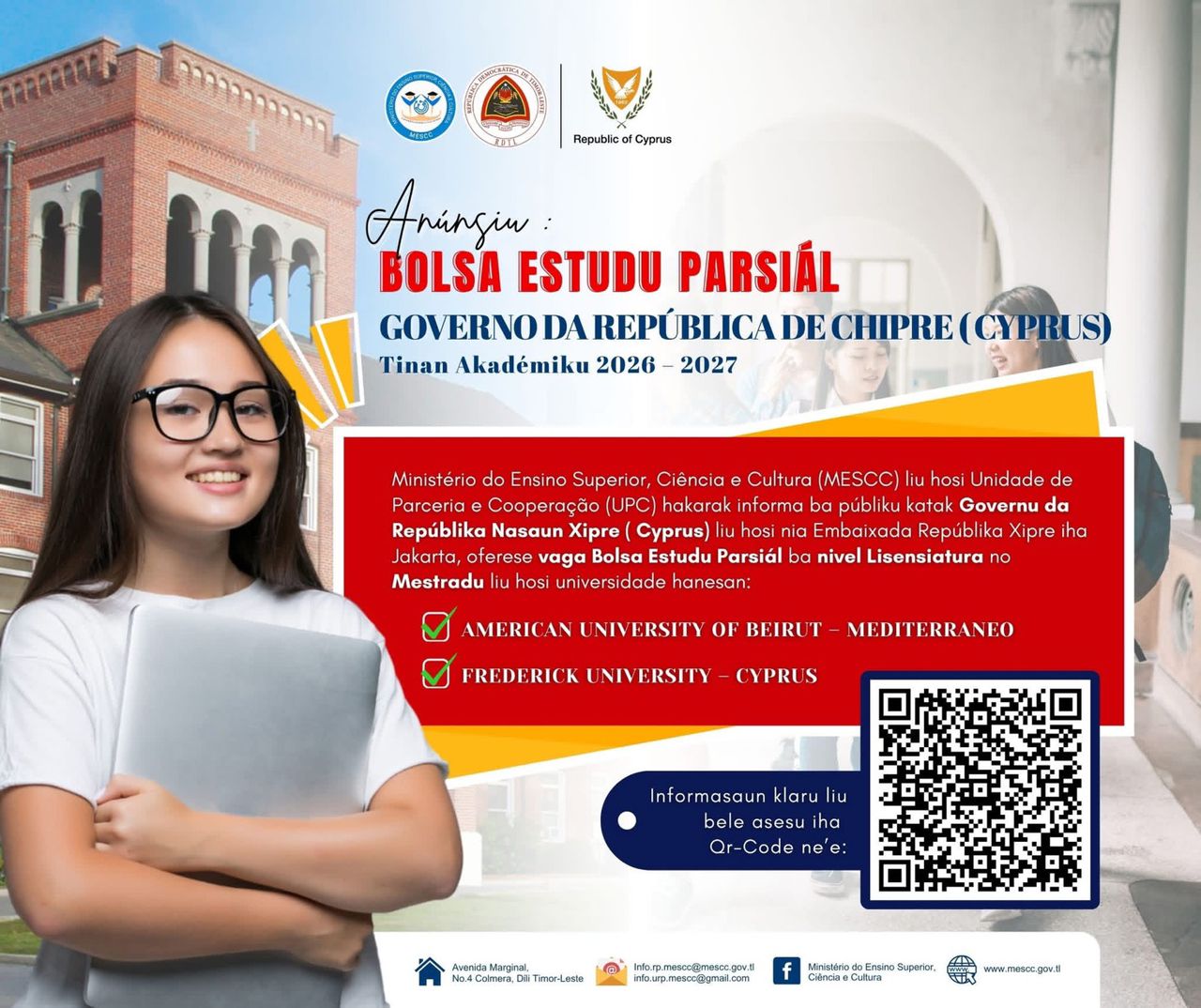 [09.18, 17/4/2026] +670 7737 8571: Ministรฉrio do Ensino Superior, Ciรชncia e Cultura (MESCC) liu hosi Unidade de Parceria e Cooperaรงรฃo (UPC) hakarak informa ba pรบbliku katak Governu da Repรบblika Nasaun Xipre ( Cyprus) liu hosi nia Embaixada Repรบblika Xipre iha Jakarta, oferese vaga Bolsa Estudu Parsiรกl ba nivel Lisensiatura no Mestradu liu hosi: